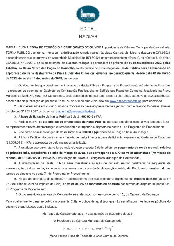 Hasta Publica concessão bar de Olhos da Ferve...