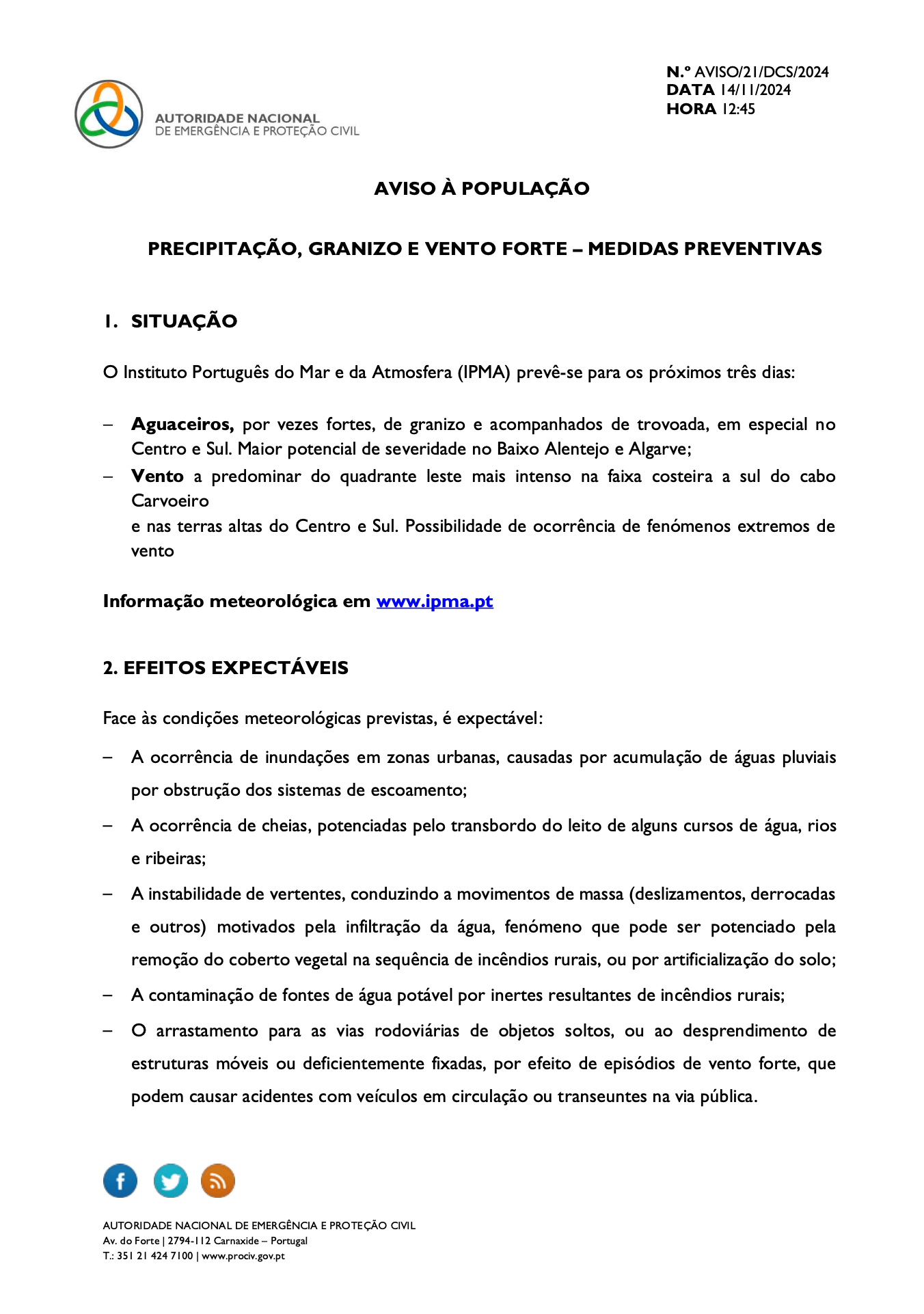 AVISO À POPULAÇÃO - Precipitação, Granizo e V...